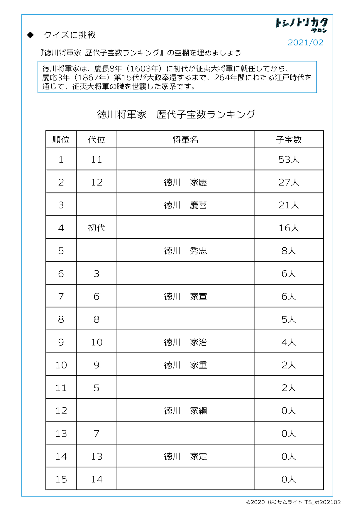 【脳若問題】第2弾「徳川将軍家 歴代子宝数ランキング」 2025 6/20 スマホで長生き★健康コラム 脳若問題 2025年6月20日 【脳若問題】第2弾は「徳川将軍家 歴代子宝数ランキング」です。 『徳川将軍家 歴代子宝数ランキング』の空欄を埋めましょう♪画像を拡大してご覧ください。 答えは次回の配信をお楽しみに。 スマホで長生き★健康コラム 脳若問題 【動画】幸せを運ぶかたづけ 「片づけは一石七鳥」 【動画】スマホの使い方第2弾「ChatGPTを使ってみよう①」 “健康コラム”に関するお問い合わせはこちら 特定非営利活動法人 介護予防で日本を元気にする会 受付時間:9:00~16:00 (土・日・祝日除く) 関連記事 【動画】スマホの使い方第6弾「Google Geminiはじめてガイド」 2026年3月10日 【脳若問題】第10弾「懐かしの歌謡曲」の答え 2026年3月10日 【脳若問題】第10弾「懐かしの歌謡曲」 2026年2月20日 【脳若問題】第9弾「穴埋め四字熟語」の答え 2026年2月10日 【動画】幸せを運ぶかたづけ 「洋服の片づけ方」 2026年2月10日 【脳若問題】第9弾「穴埋め四字熟語」 2026年1月20日 【脳若問題】第8弾「世界の名画」の答え 2026年1月10日 【動画】スマホの使い方第5弾「LINEを乗っ取りから守る」 2026年1月10日
