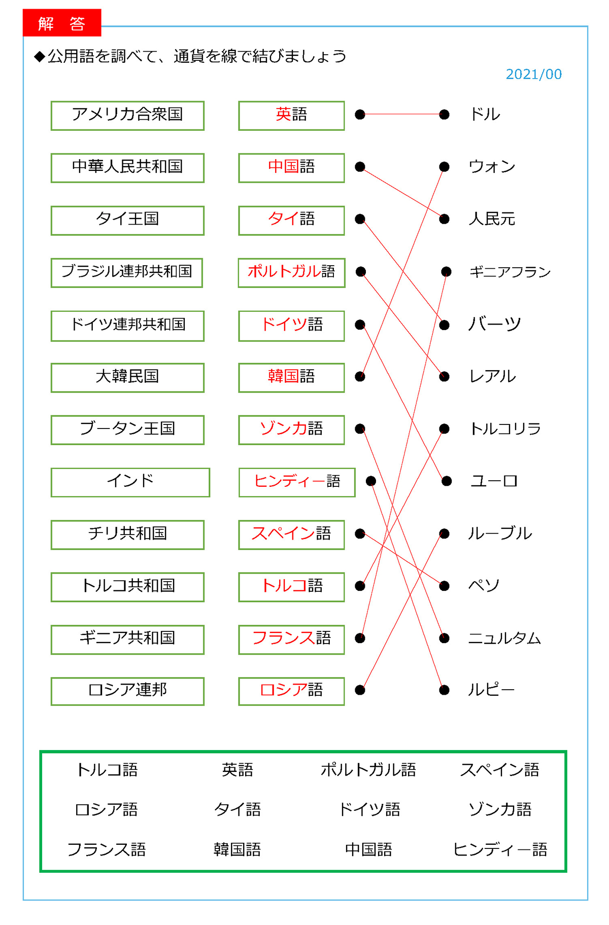 【脳若問題】第5弾「海外公用語と通貨」の答え 2025 10/10 スマホで長生き★健康コラム 脳若問題 2025年10月10日 【脳若問題】第5弾「海外公用語と通貨」の答えです。 画像を拡大してご覧ください。 スマホで長生き★健康コラム 脳若問題 【脳若問題】第5弾「海外公用語と通貨」 【動画】幸せを運ぶかたづけ 「捨てられないのは当たり前」 “健康コラム”に関するお問い合わせはこちら 特定非営利活動法人 介護予防で日本を元気にする会 受付時間:9:00~16:00 (土・日・祝日除く) 関連記事 【動画】スマホの使い方第6弾「Google Geminiはじめてガイド」 2026年3月10日 【脳若問題】第10弾「懐かしの歌謡曲」の答え 2026年3月10日 【脳若問題】第10弾「懐かしの歌謡曲」 2026年2月20日 【脳若問題】第9弾「穴埋め四字熟語」の答え 2026年2月10日 【動画】幸せを運ぶかたづけ 「洋服の片づけ方」 2026年2月10日 【脳若問題】第9弾「穴埋め四字熟語」 2026年1月20日 【脳若問題】第8弾「世界の名画」の答え 2026年1月10日 【動画】スマホの使い方第5弾「LINEを乗っ取りから守る」 2026年1月10日