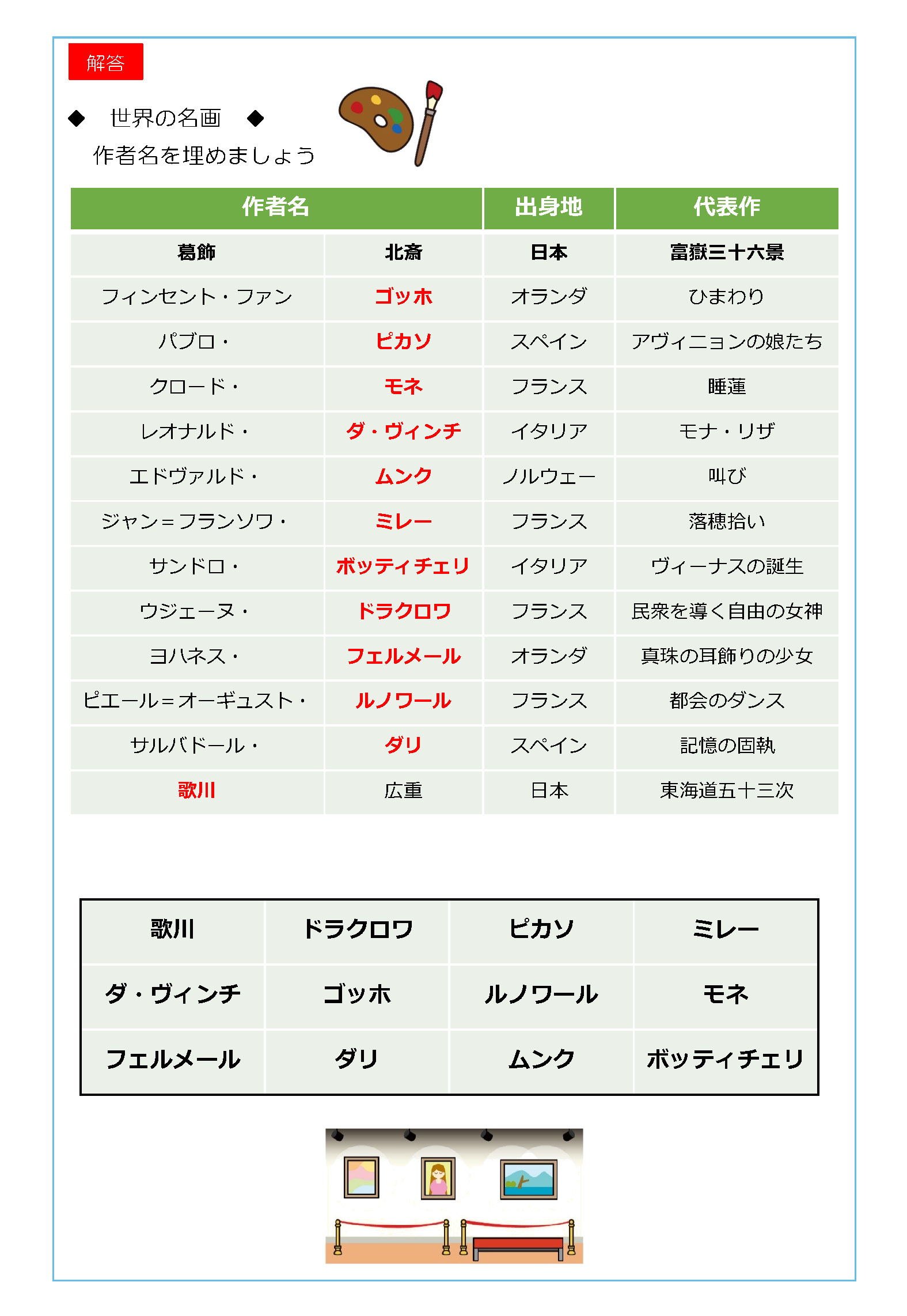 【脳若問題】第8弾「世界の名画」の答え 2026 1/10 スマホで長生き★健康コラム 脳若問題 2026年1月10日 【脳若問題】第8弾「世界の名画」の答えです。 画像を拡大してご覧ください。 スマホで長生き★健康コラム 脳若問題 【脳若問題】第8弾「世界の名画」 【動画】スマホの使い方第5弾「LINEを乗っ取りから守る」 “健康コラム”に関するお問い合わせはこちら 特定非営利活動法人 介護予防で日本を元気にする会 受付時間:9:00~16:00 (土・日・祝日除く) 関連記事 【動画】スマホの使い方第6弾「Google Geminiはじめてガイド」 2026年3月10日 【脳若問題】第10弾「懐かしの歌謡曲」の答え 2026年3月10日 【脳若問題】第10弾「懐かしの歌謡曲」 2026年2月20日 【脳若問題】第9弾「穴埋め四字熟語」の答え 2026年2月10日 【動画】幸せを運ぶかたづけ 「洋服の片づけ方」 2026年2月10日 【脳若問題】第9弾「穴埋め四字熟語」 2026年1月20日 【動画】スマホの使い方第5弾「LINEを乗っ取りから守る」 2026年1月10日 【脳若問題】第8弾「世界の名画」 2025年12月20日
