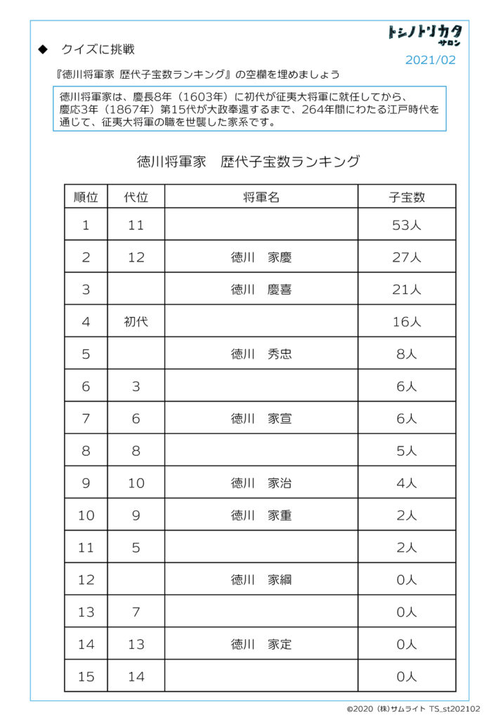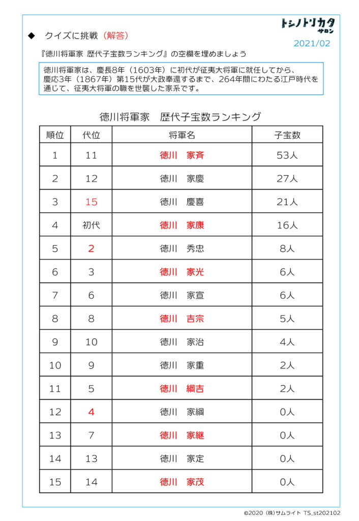 【脳若問題】第2弾「徳川将軍家 歴代子宝数ランキング」の答えです。 画像を拡大... -